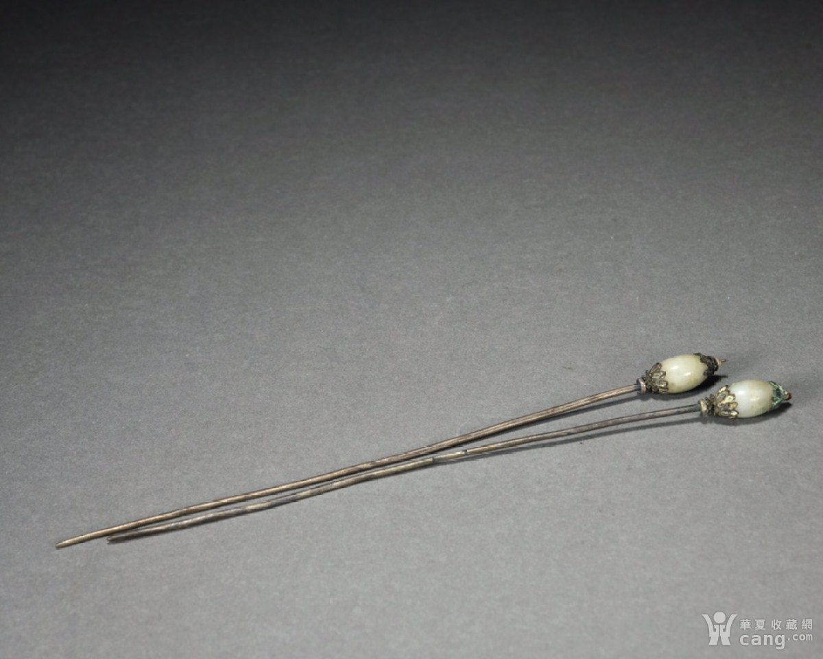 回流·老银胎镶老翡翠发簪一对。