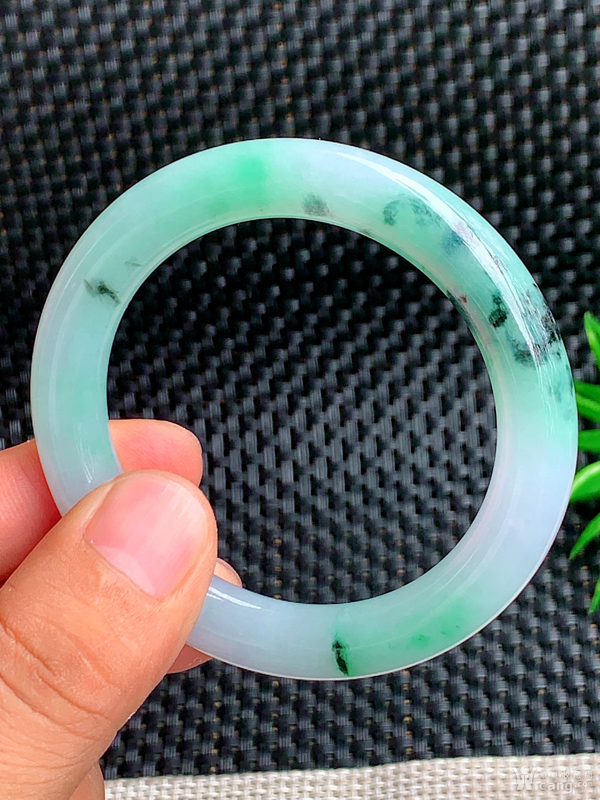 缅甸天然翡翠A货冰透水润飘花圆条手镯56.5圈口