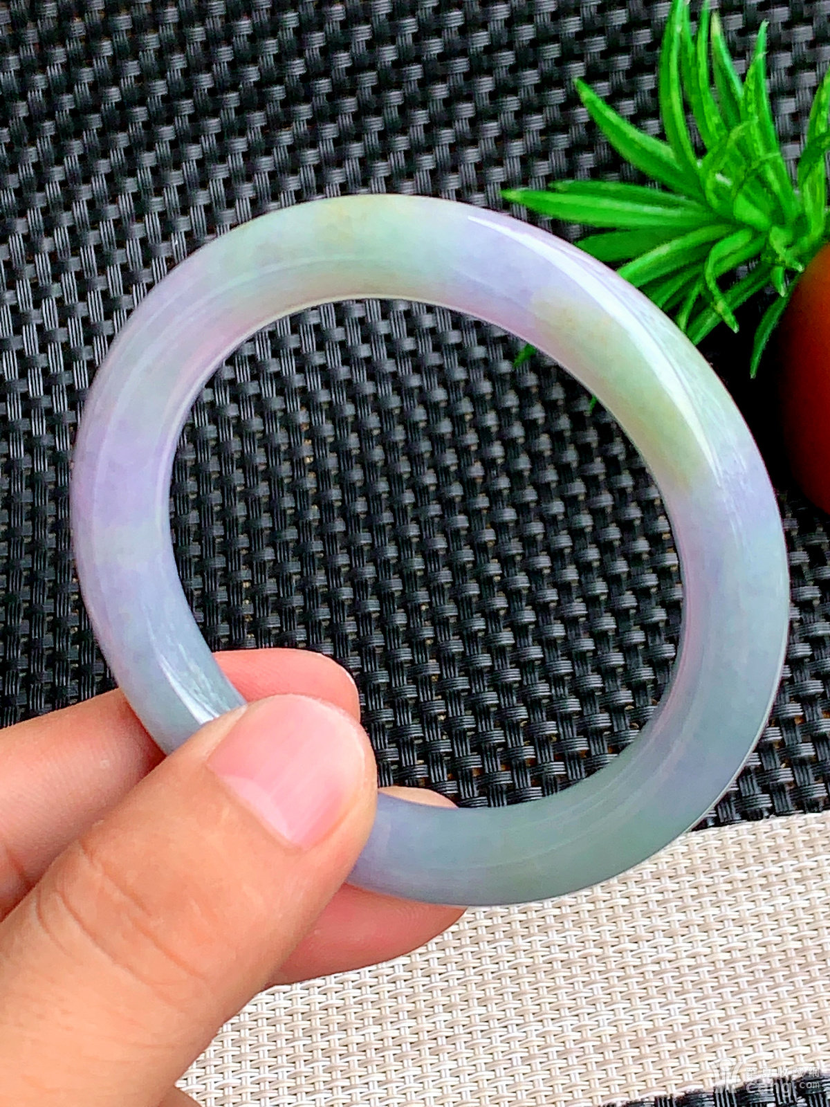 缅甸天然翡翠A货冰润紫黄双彩圆条手镯57.5圈口