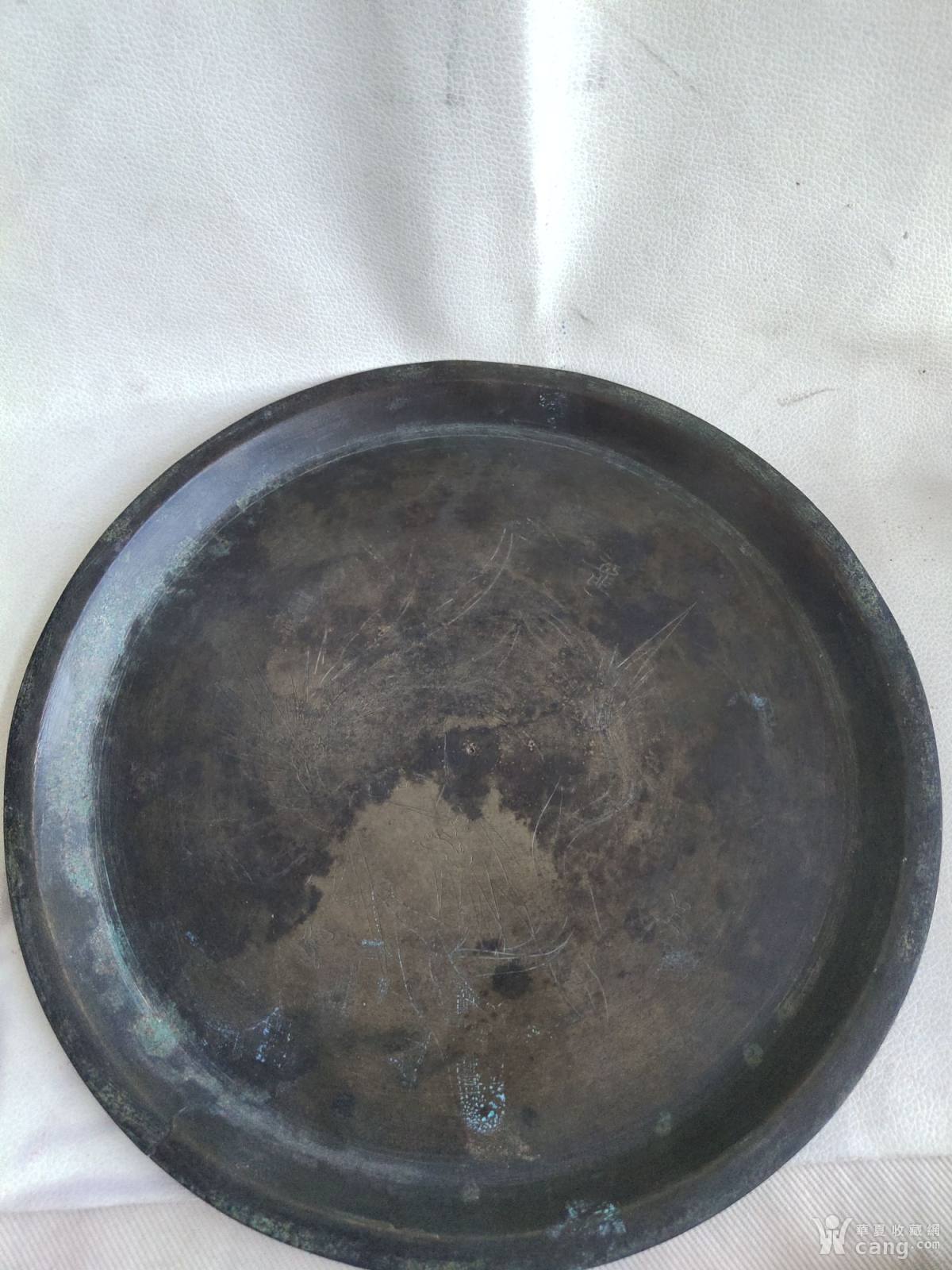 大个清代黄铜刻花龙凤呈祥茶盘一个,口沿短线如图,余完整。