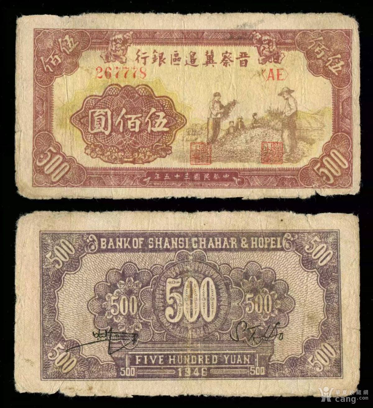 民国35年晋察冀边区银行500元(摘豆荚)原票少见品种