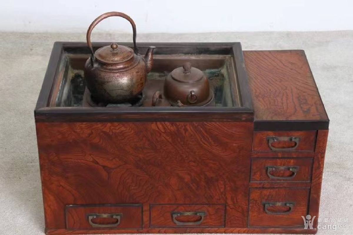 榉木影子木炭炉,整体榉木影子木独板,内部有铜质茶壶和温酒器,