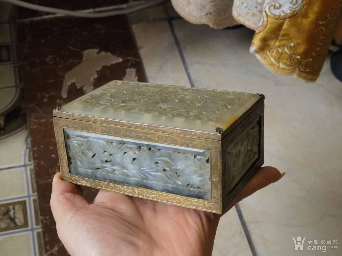 民国雕祥云蝙蝠纹铜鎏金开窗镶嵌雕花玉片珠宝首饰盒!