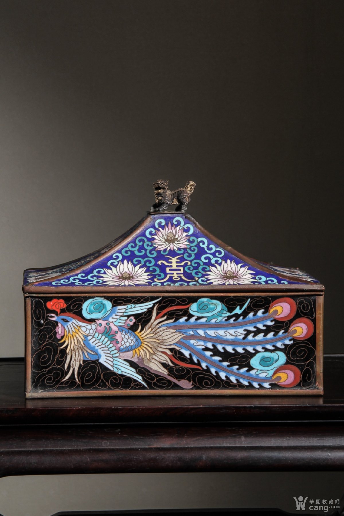 清 铜胎景泰蓝狮钮双凤献瑞文房长方盖盒