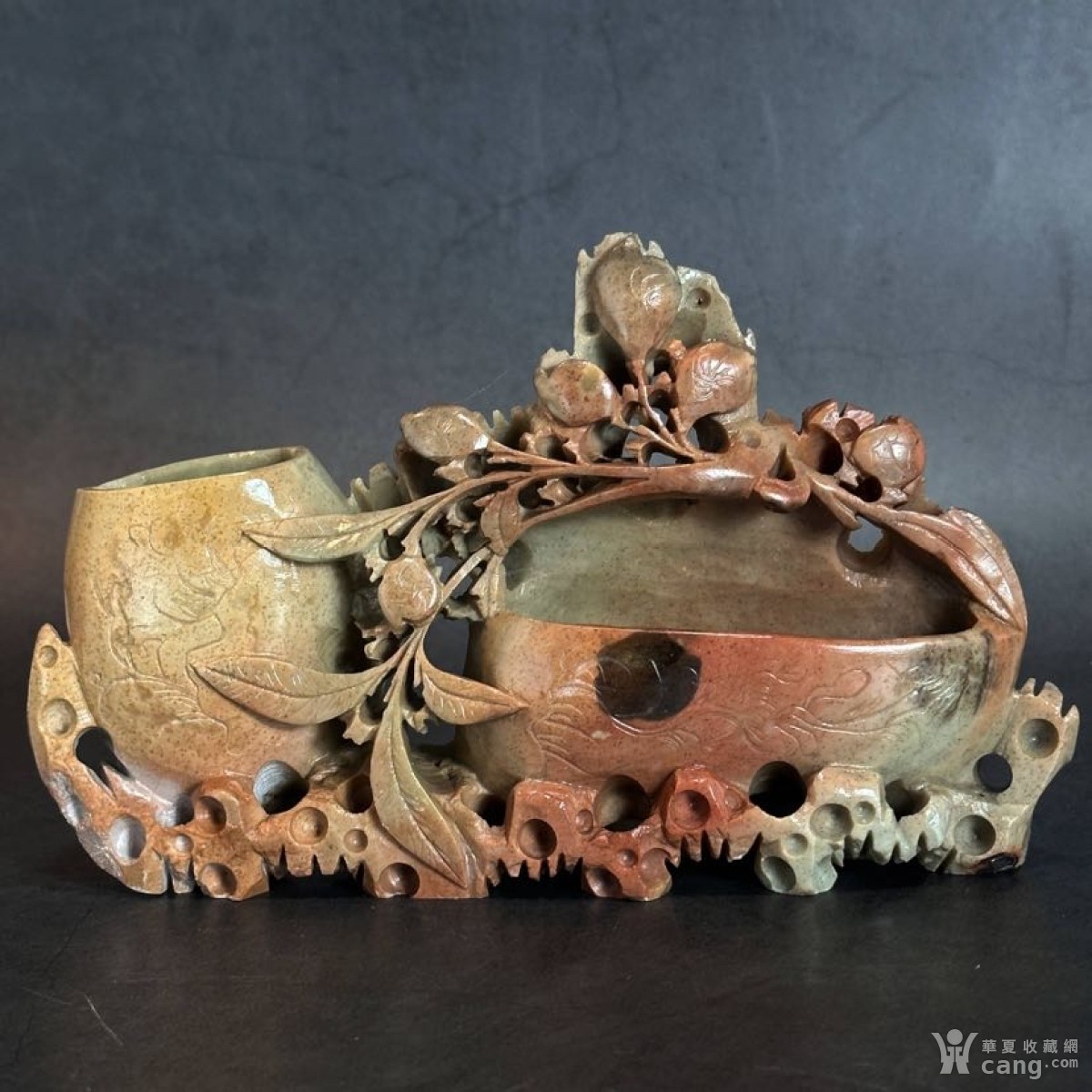 清代寿山石精雕花卉文房笔筒笔洗摆件