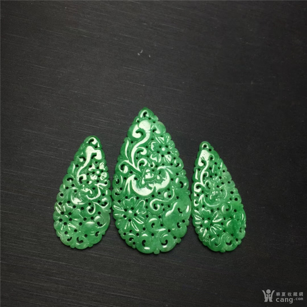 a410创汇期糯冰种满绿翡翠蝙蝠如意纹水滴形花片三件套