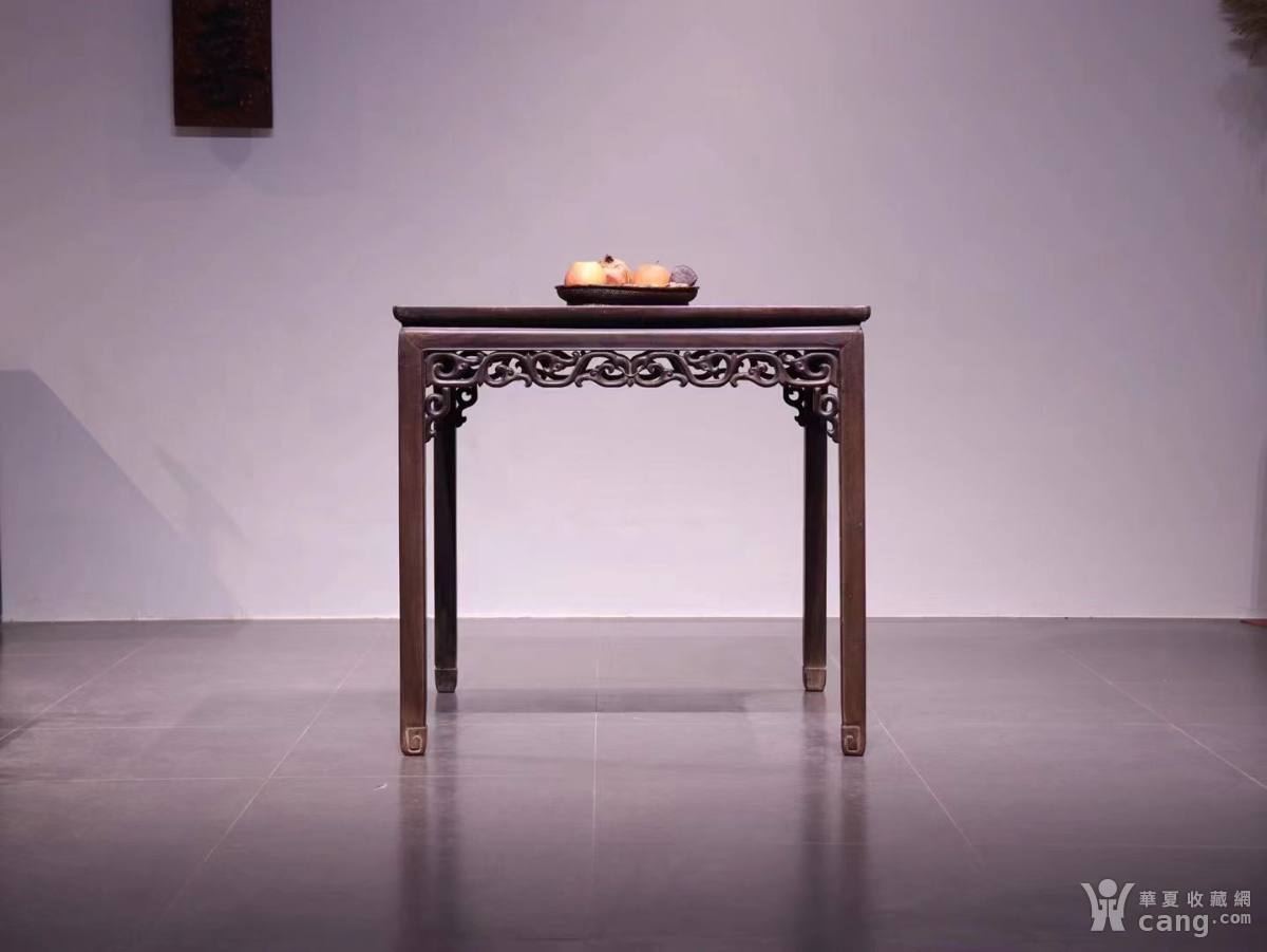老红木方桌;老红木为材,面板两拼,牙板透雕缠枝纹,方腿马蹄回