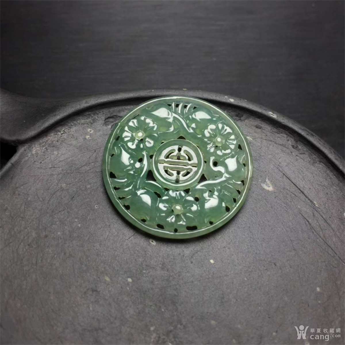T899创汇期冰种晴水绿翡翠寿字花牌圆形镶嵌件