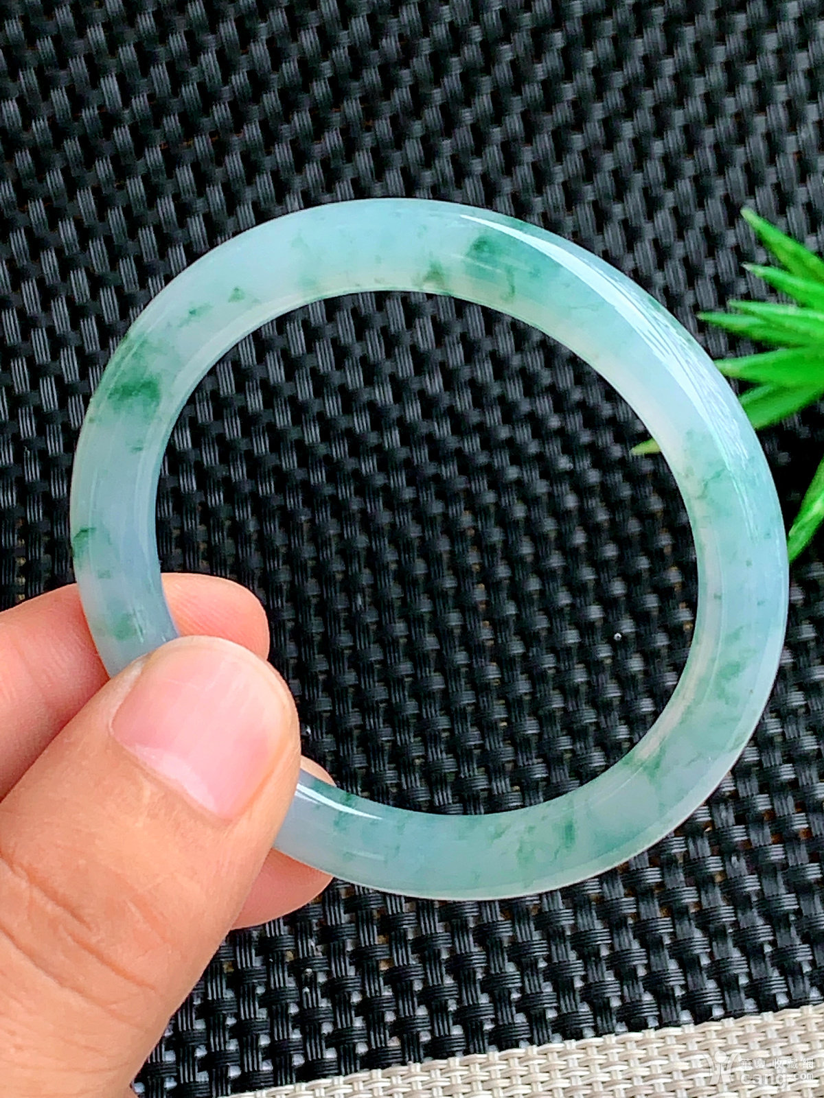 缅甸天然翡翠A货冰透水润飘花圆条手镯53.3圈口