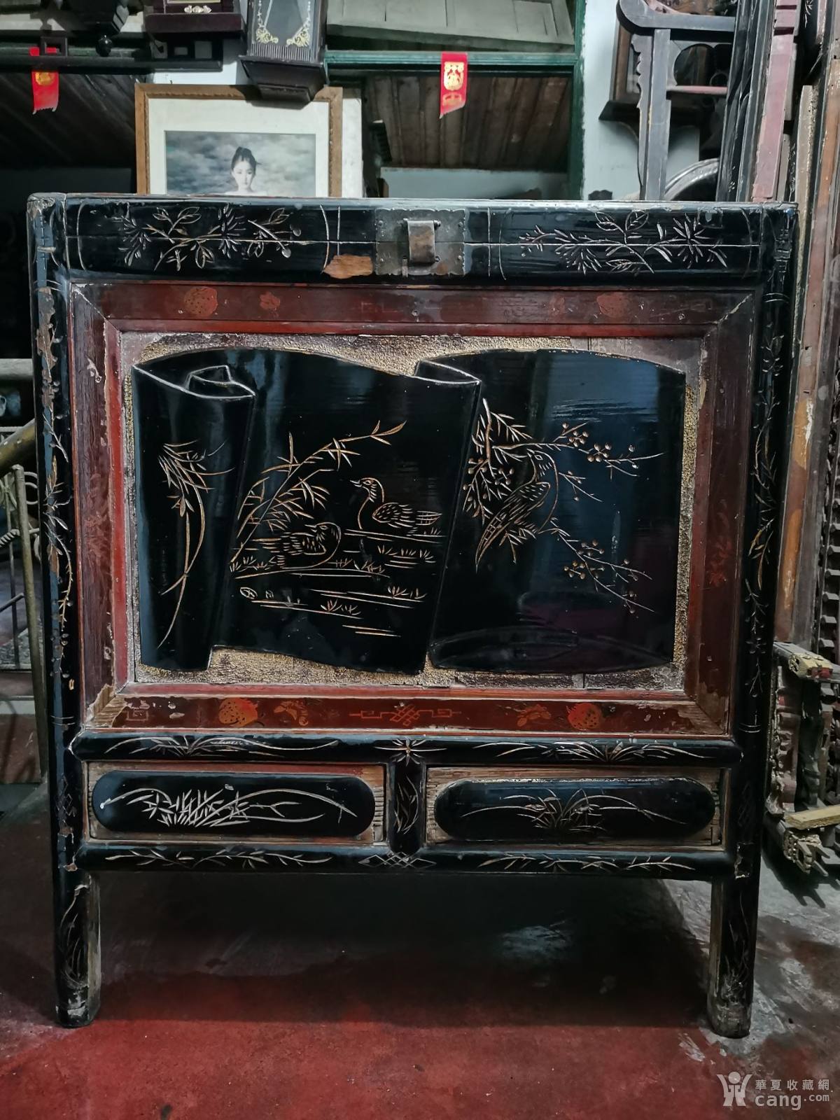清·大漆漆金老木柜·花鸟婴戏书卷图,古韵味浓,手工浅刻花鸟,