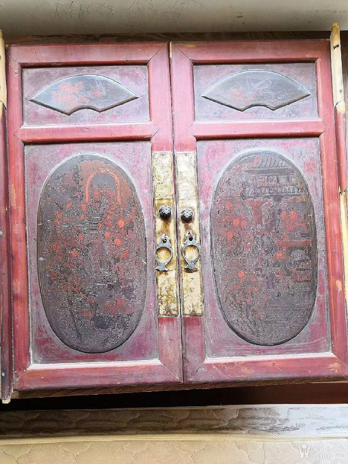 清代戏曲人物漆画柜门画板一对