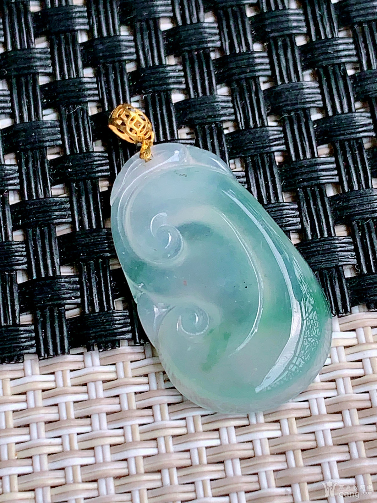 缅甸天然翡翠A货18k金扣冰透水润飘花如意吊坠