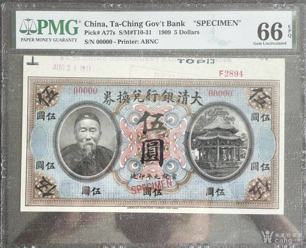 稀少品1909年大清银行李鸿章像兑换券伍圆样钞PMG评级66