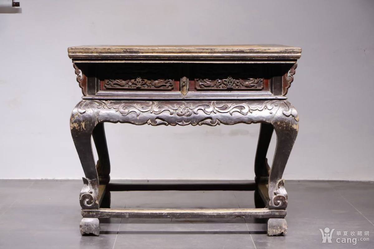 【清早期三弯腿雕花供桌】;朱漆点缀,四面雕花卉 龙纹饰朱漆,