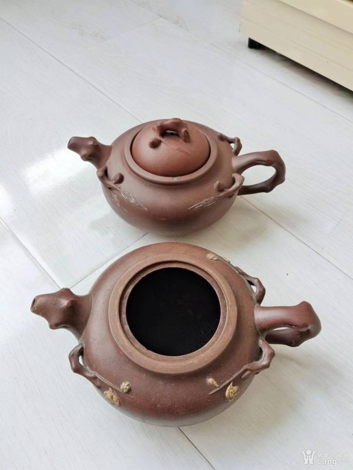 七八十年代桃纹和梅花纹手工紫砂茶壶两把同售