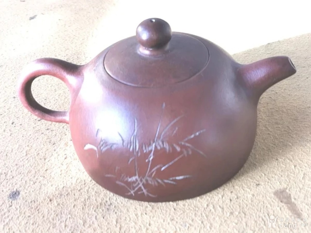 清代时期紫砂壶,雕刻竹子的圆执壶