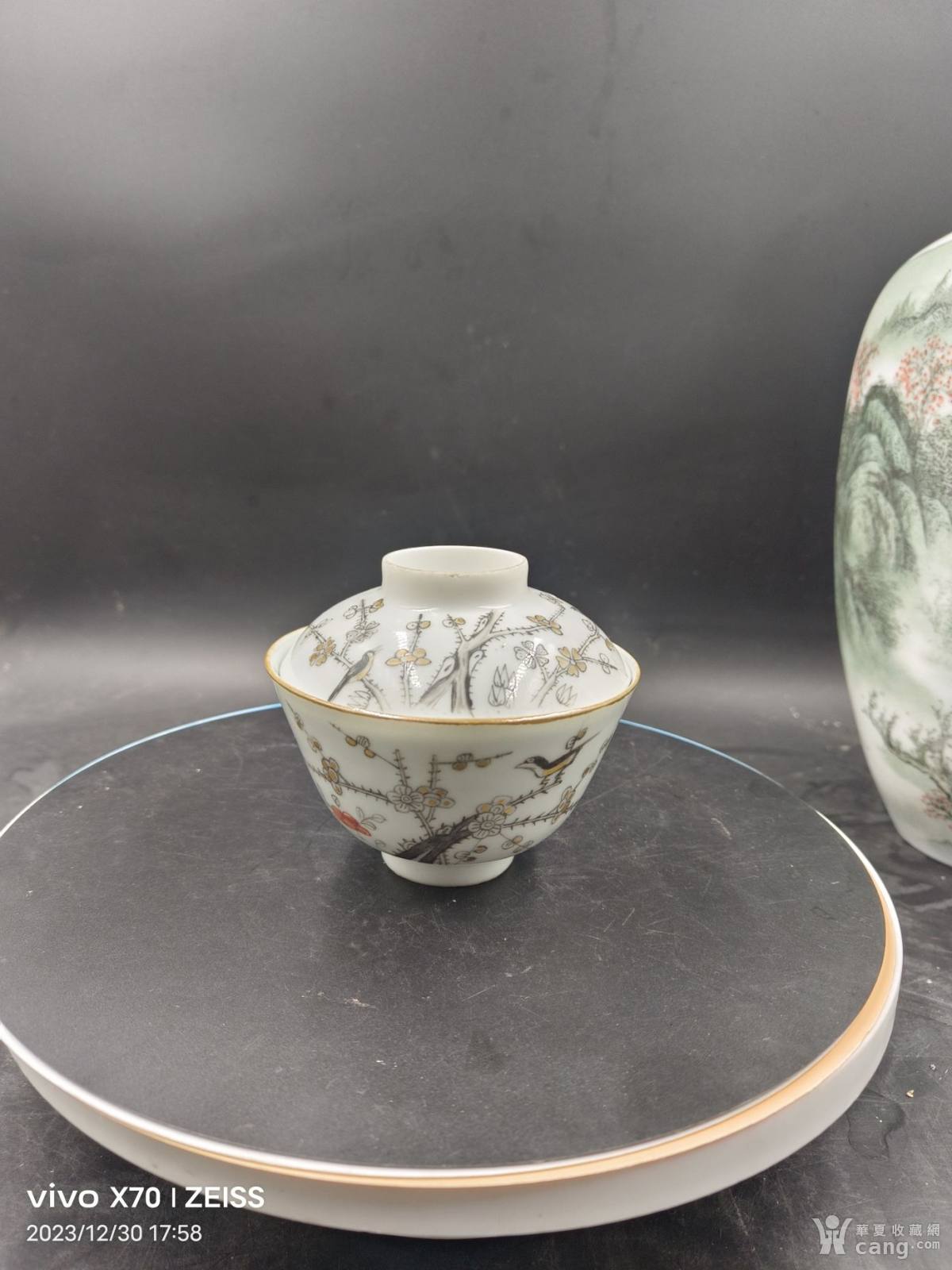 精细同治矾红墨彩喜上眉梢盖碗