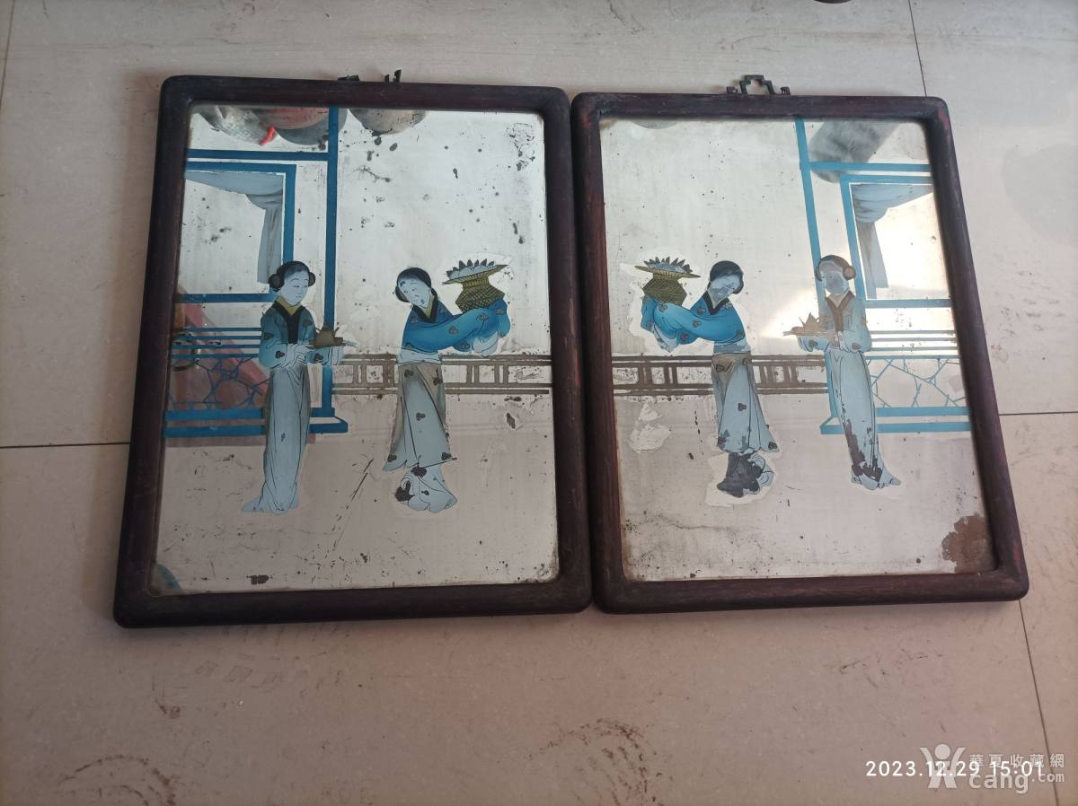 清代二美女挂镜一对,左边挂环有缺损,右边镜面有点脱漆,尺寸如