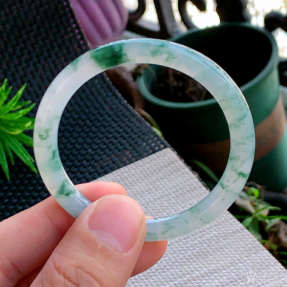 缅甸天然翡翠A货冰透水润飘绿圆条手镯53.1圈口