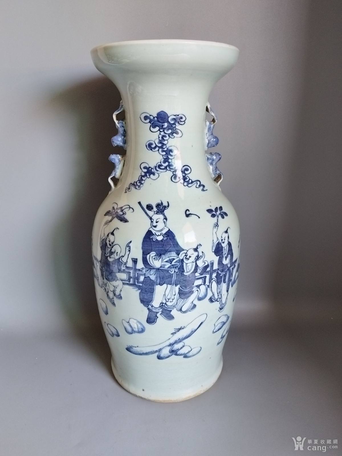 清中豆青釉青花加白五子夺魁人物瓶