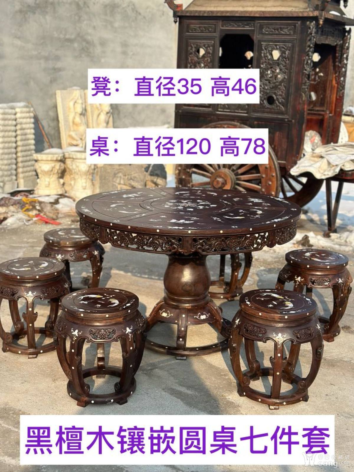 黑檀木 大圆桌七件套 镶嵌彩贝 分量十足 锓卯结构 四周镂空