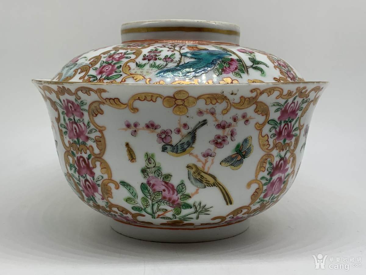 晚清粉彩描金开窗花鸟盖碗