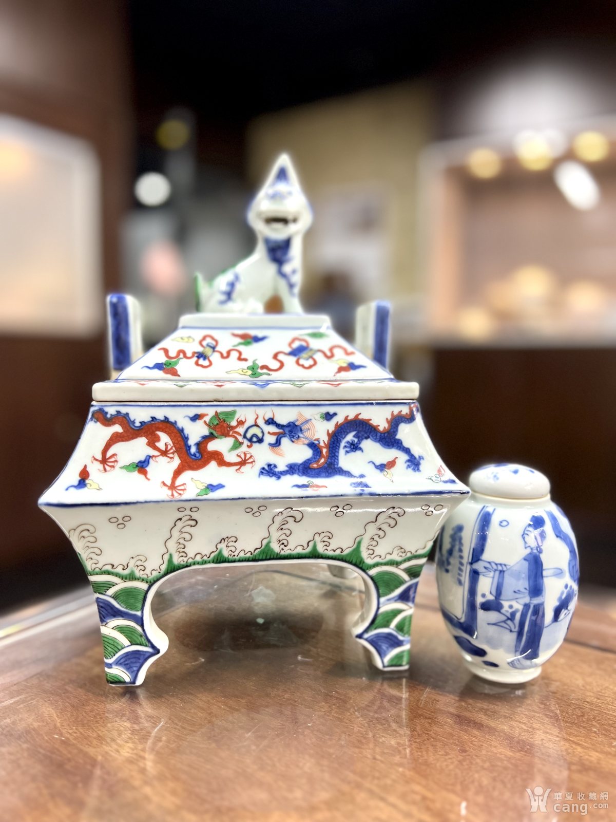 晚清仿明万历官五彩海水龙纹四方瑞兽钮鼎