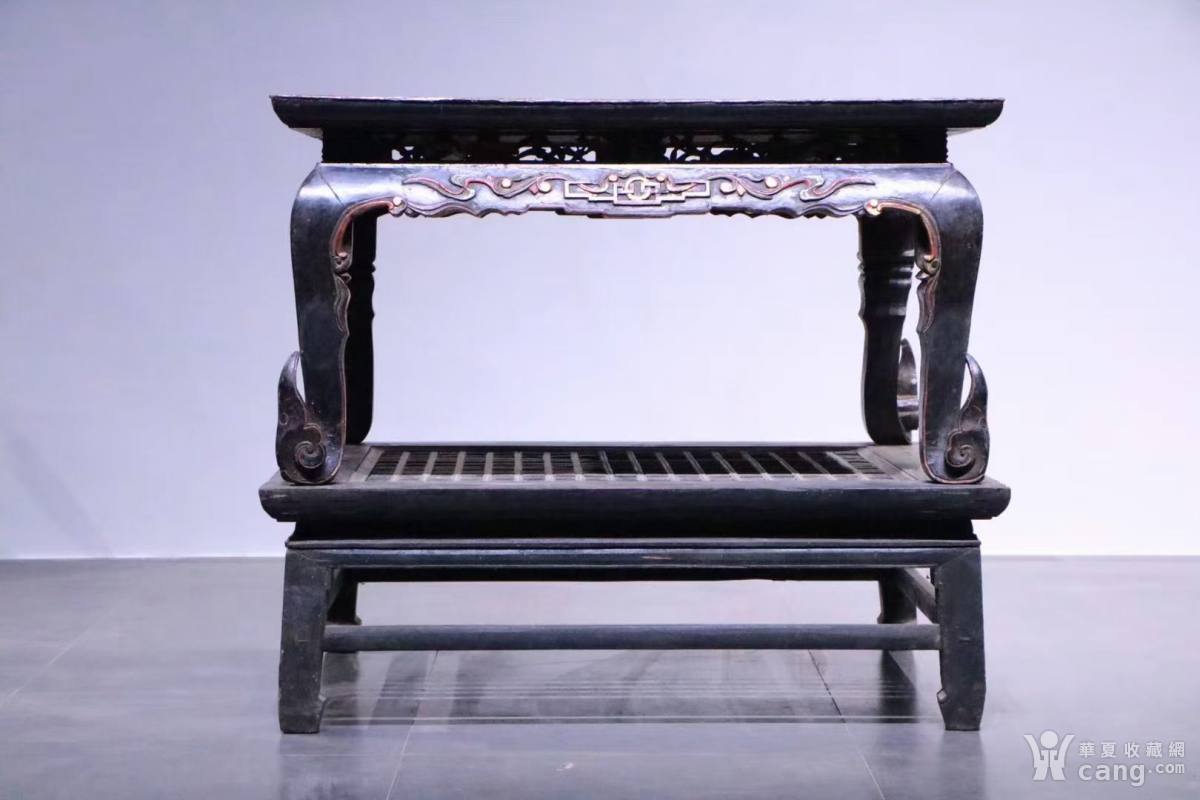 大漆有佳器•弯腿供桌:桌面为硬板面,有束腰透雕莲花卷草纹,鼓