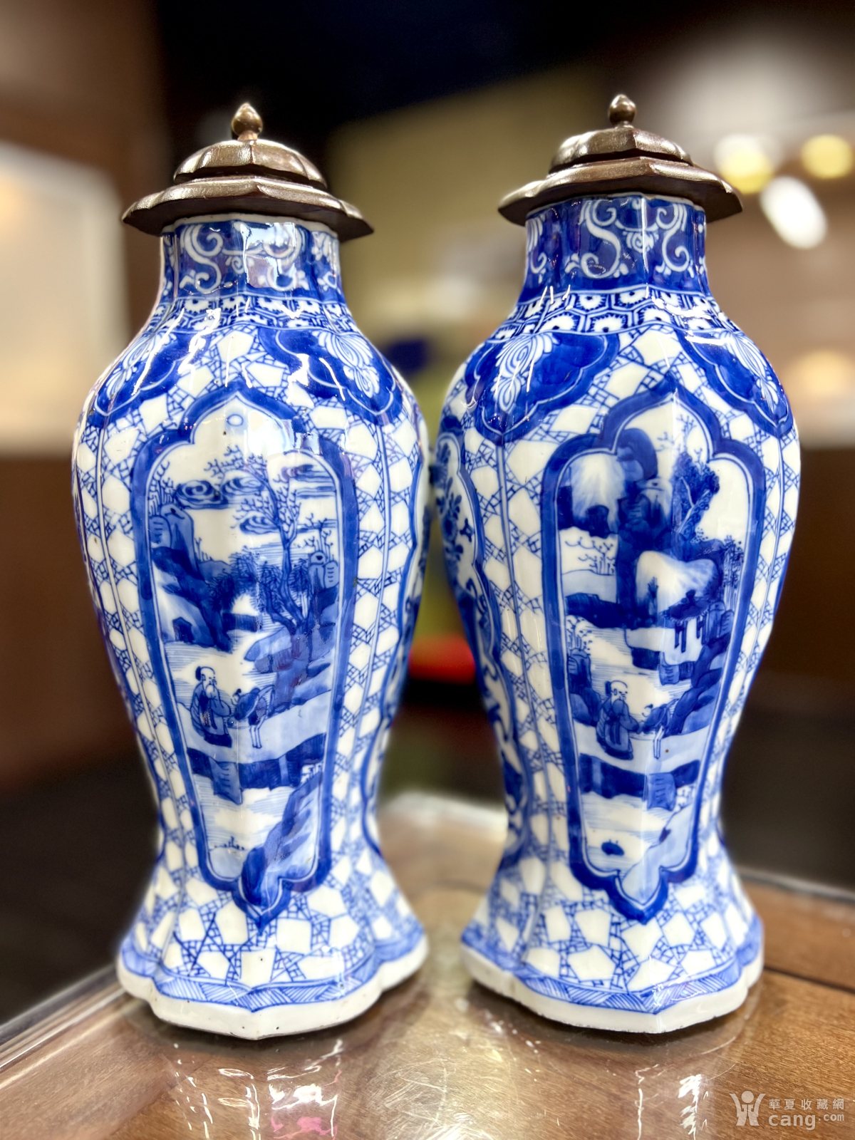 清康熙精品青花高士人物风景纹海棠瓶一对