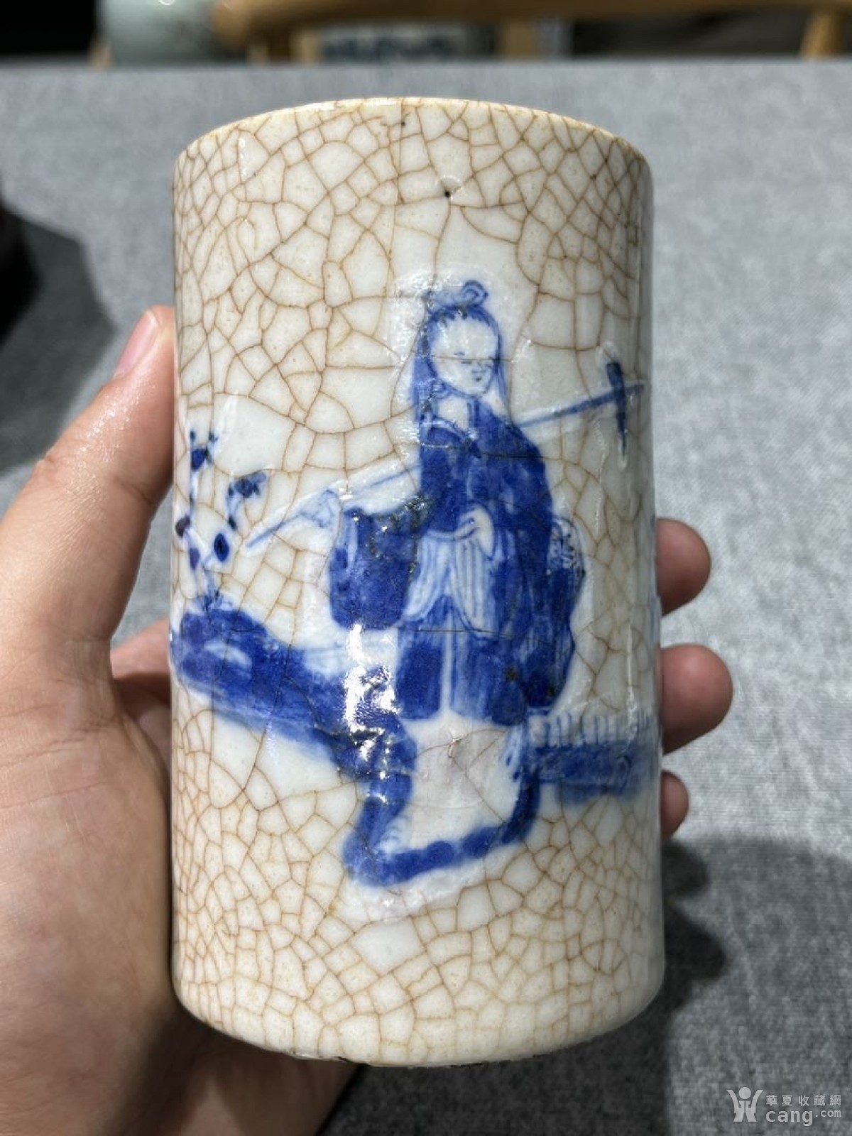 清代同光时期哥釉堆白青花「麻姑献寿」文房笔筒