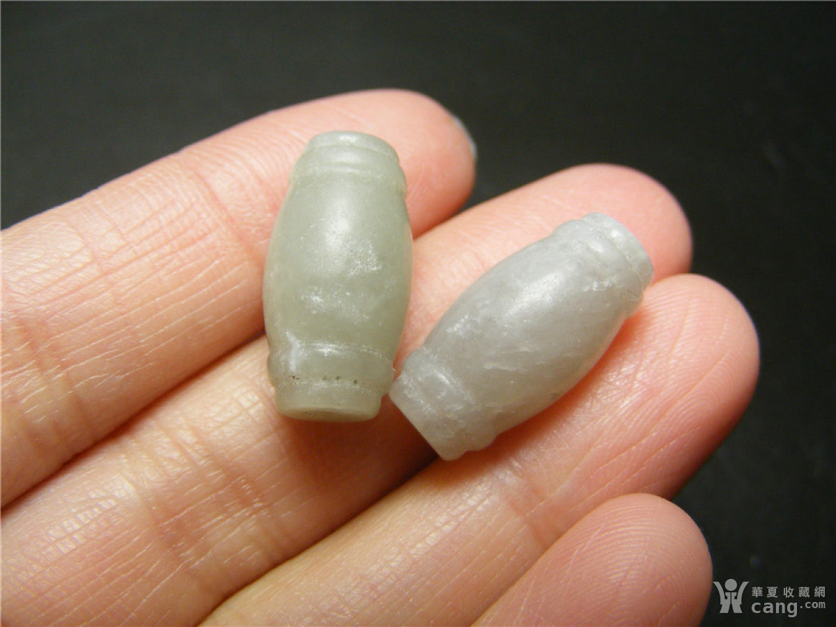 1164 几十年的和田青白玉手工雕旋纹鼓腹小玉管珠2颗