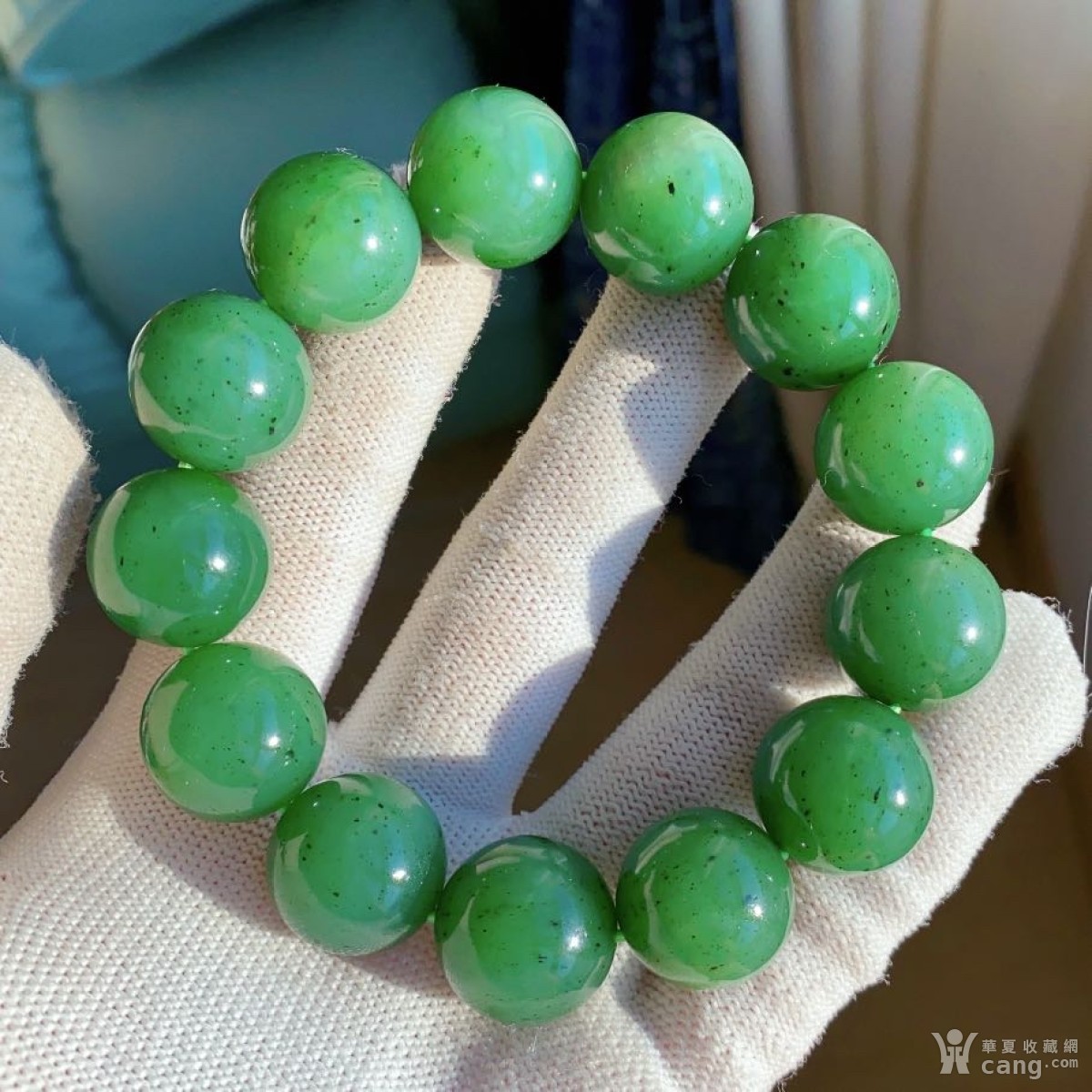 B888完美无裂天然原矿和田玉俄料乌兰海菠菜绿碧玉大珠手串!