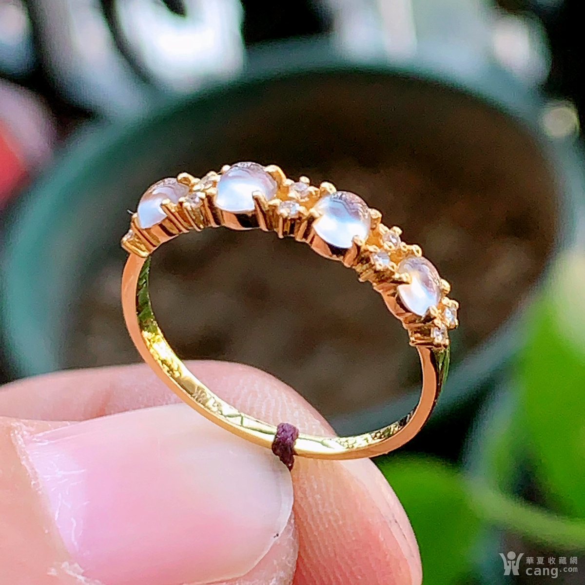 缅甸天然翡翠A货18k金伴钻冰种起荧光蛋面戒指17圈口