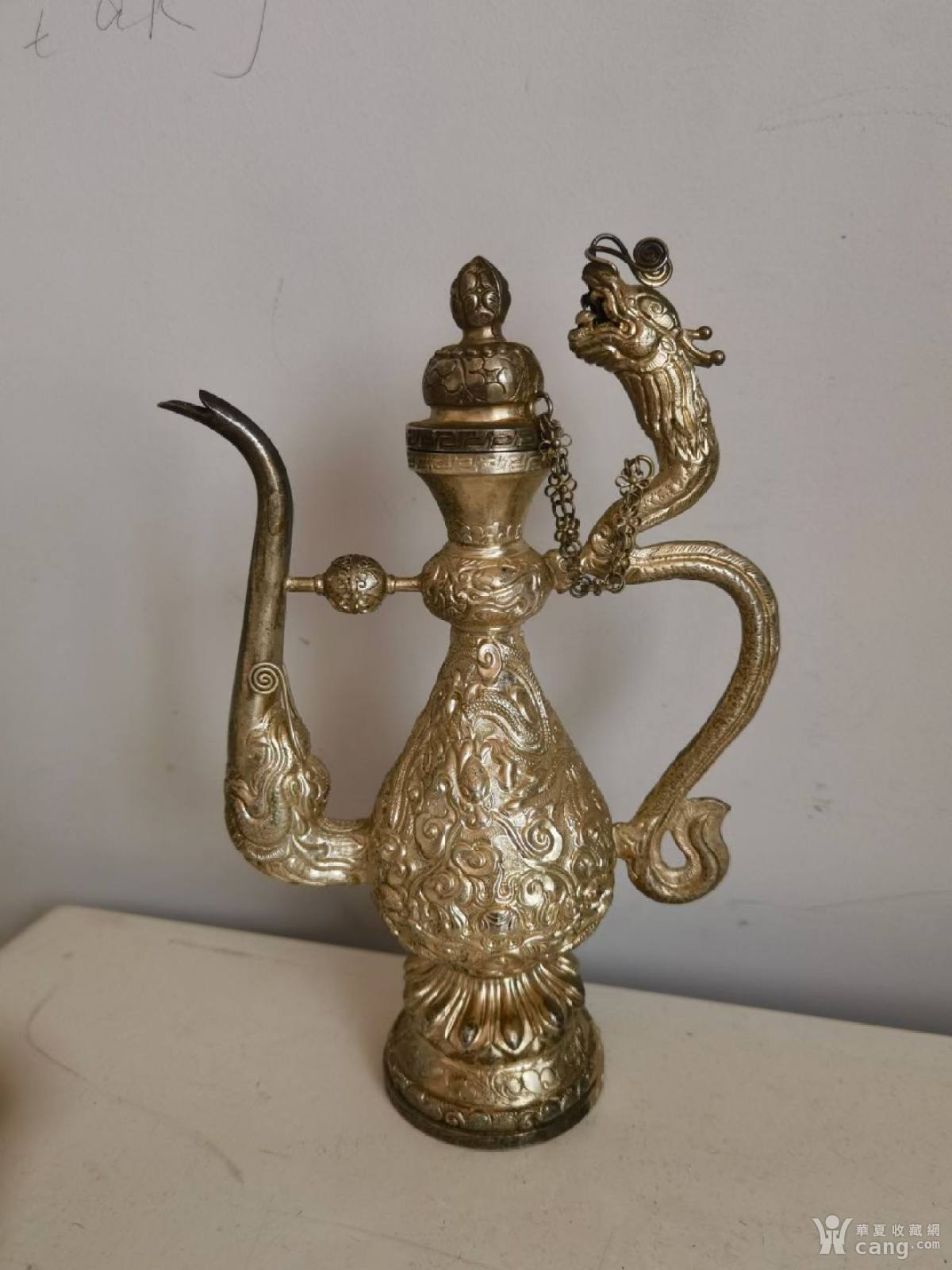民国或解放初刻云龙纹铜鎏银酒壶,高21,完整没用过