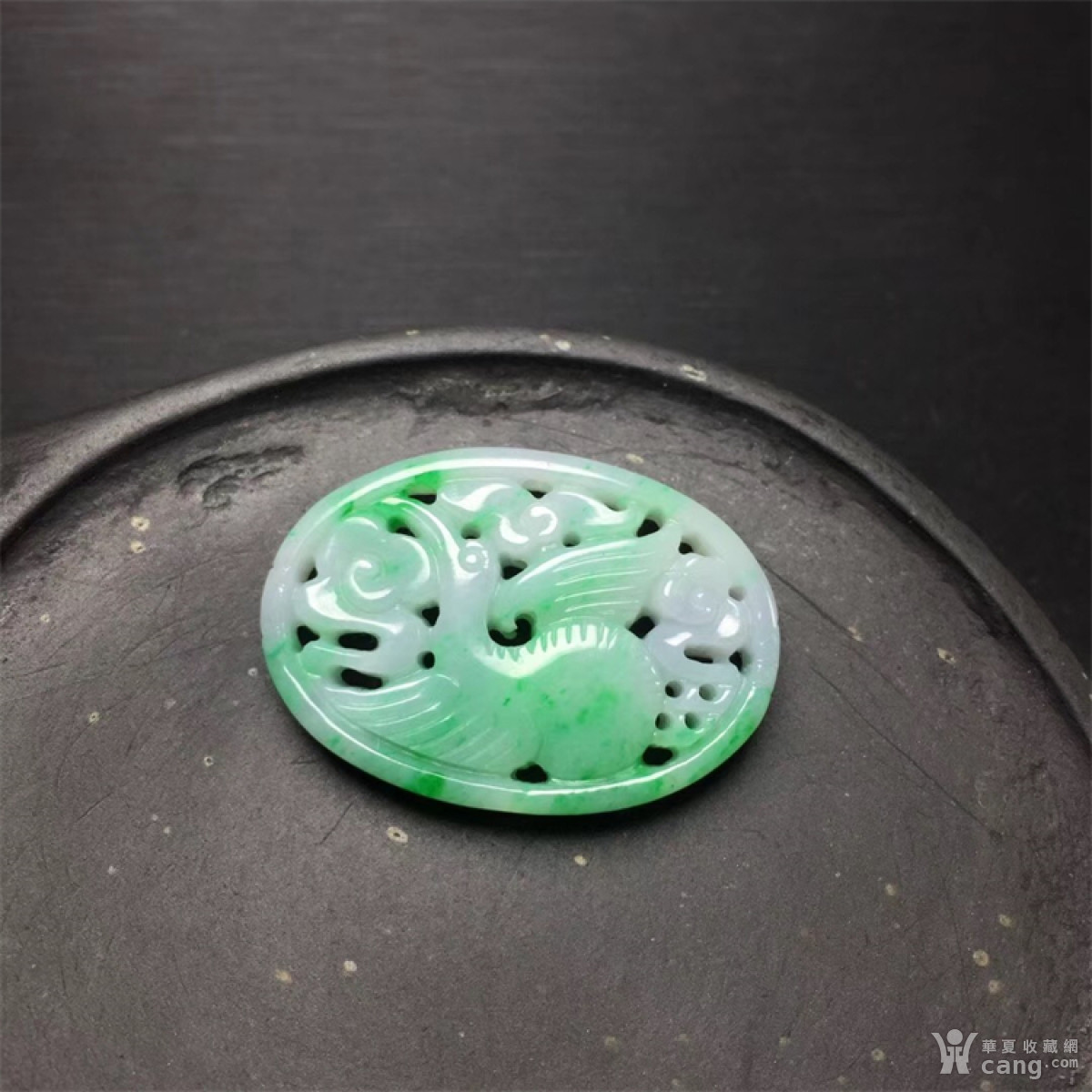 b480创汇期白底青飘阳绿翡翠仙鹤呈祥背云吊坠