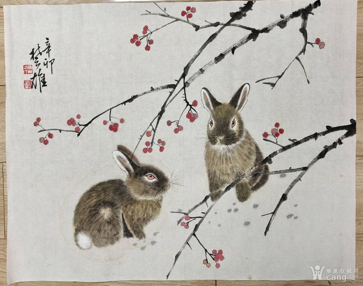 当代名家方楚雄《双兔》软片。题款:辛卯,楚雄。印章:岭东方氏