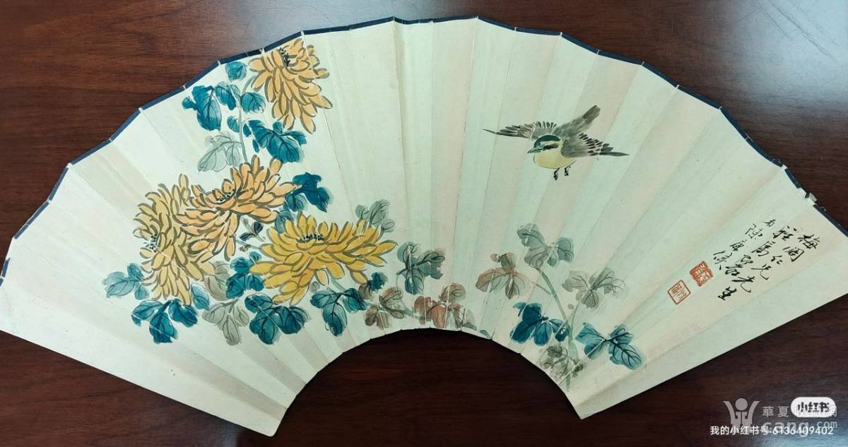 陈康侯花鸟扇面《菊花小鸟》