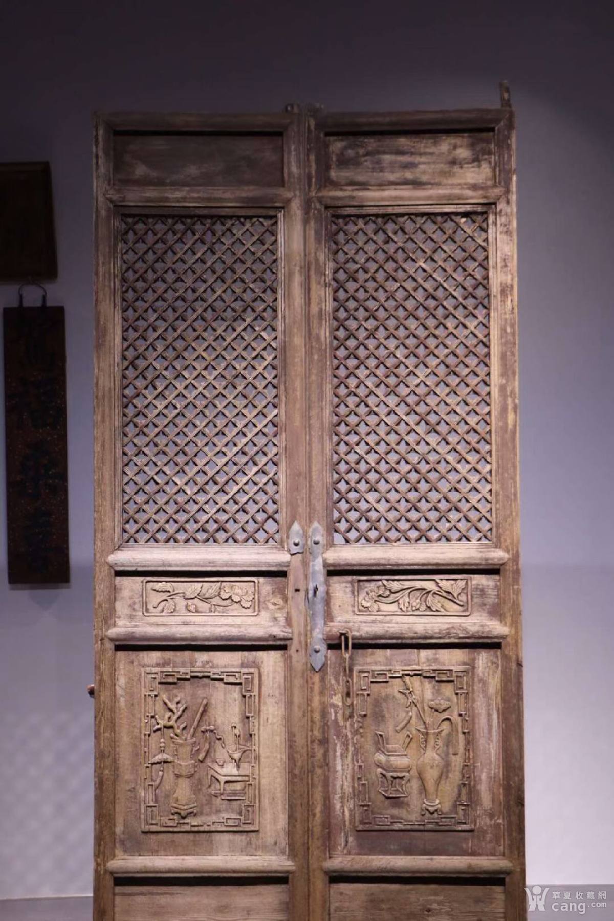 博古纹格子门;浮雕博古纹图案,花格加树叶点缀纹饰,雕工精